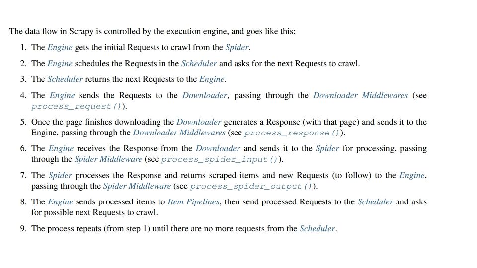 然后就是 yield scrapy.Request(url=next,callback=self.parse) 这条语句,next是我们匹配得到的下一页的URL,scrapy.Request方法会将其封装成一个request,而callback回调函数则是下载request得到response后处理该response的函数。我曾一度的以为scrapy.Request方法会直接将url做成request发送并立刻执行回调函数以形成一个递归的爬取。这里需要了解一下scrapy工作原理
