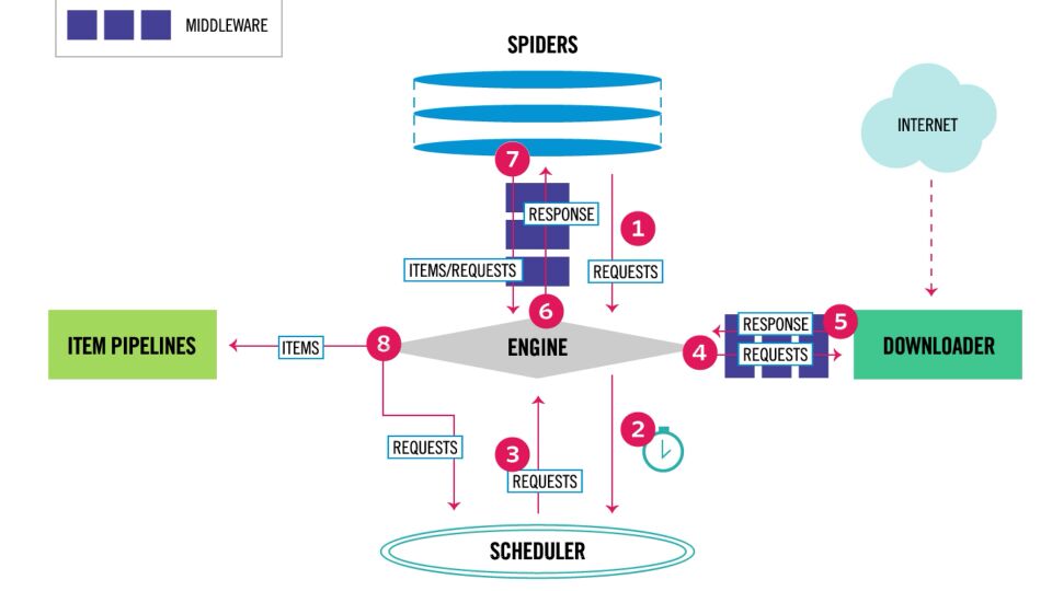 Scrapy Middleware分为两种,分别是Downloader Middleware(下载中间件)和Spider Middleware(Spider中间件)。Downloader Middleware(下载中间件)是处于Scrapy的Request和Response之间的处理模块,而Spider Middleware(Spider中间件)是介入到Scrapy的Spider处理机制的钩子框架。通过Scrapy的工作流程图,我们可以看到他的架构。