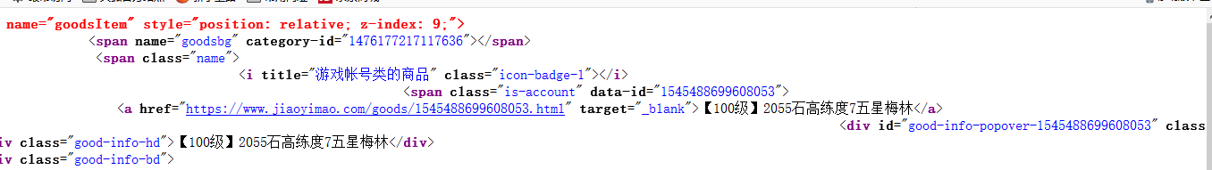 接下来分析网站,可以发现,我们选中一个游戏后并观察源代码可以发现,交易猫把商品的名字和URL都写在了一个标签中,那我们可以直接通过selector提取a标签来筛选获取所需信息。