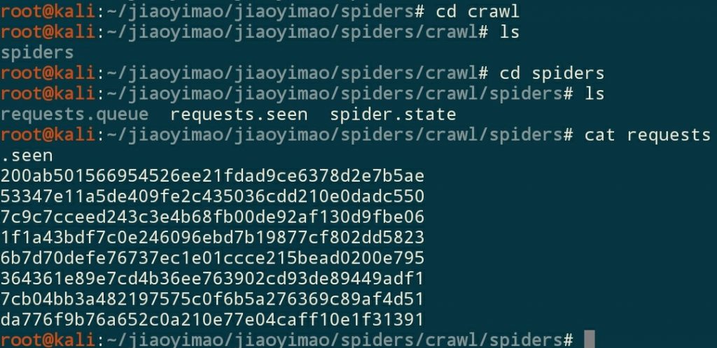 然后我们就可以发现出现了一个文件夹**crawl/spiders,**这里面保存着requests队列和爬取过的url的指纹,下次如果想接着爬的时候只需要再次执行这个命令,也就是指定队列及指纹保存路径即可实现断点爬取。