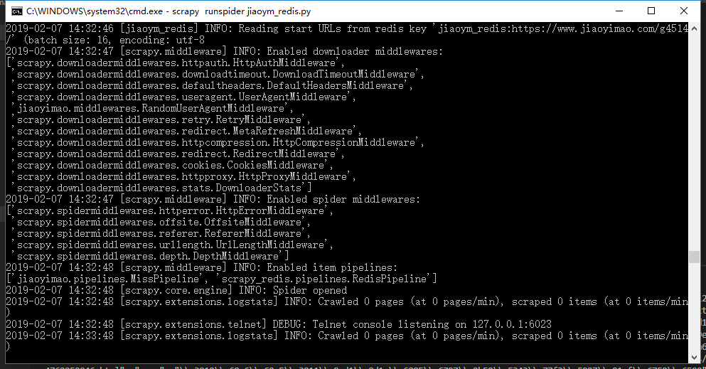 可以看到,Scrapy成功启动并进入等待状态,因为这时候我并没有给 jiaoym_redis:start_urls 列表导入值,一旦lpush了一个start_url给列表,scrapy便会启动工作,获取该url开始爬取。
