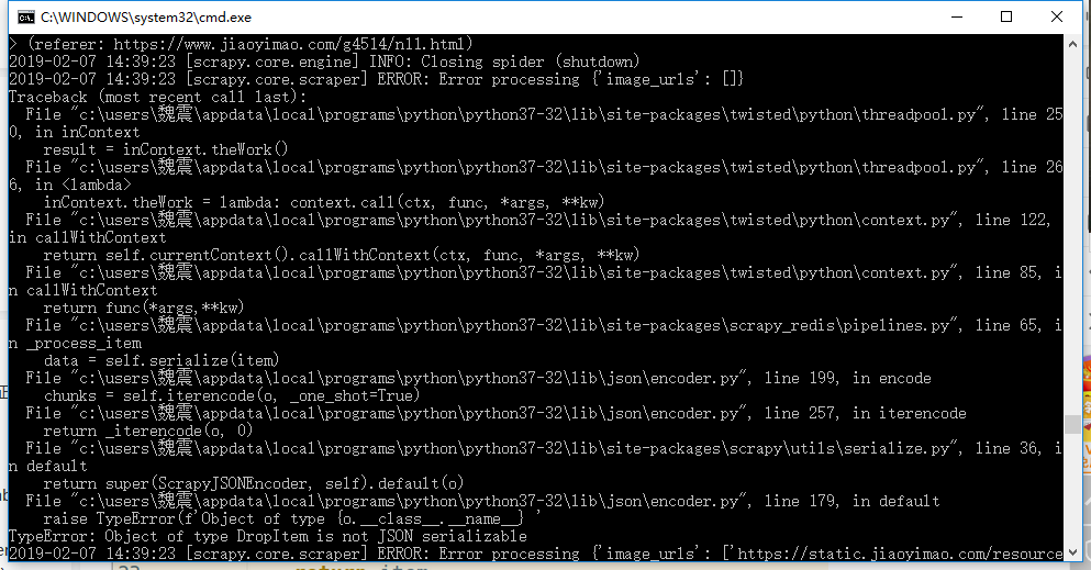 看到提示可以大致了解到是因为DropItem对象无法序列化存入数据库引起的。因为在python中,各个对象其实都是由类生成的实例,但是数据库中是无法存储这种实例的,因此我们需要对其进行序列化,当我们需要这些数据时再从数据库中取出进行反序列化形成对象。但不是所有的数据都能进行序列化的,比如这里的DropItem对象,因为DropItem对象本来就是需要被过滤的,因此我们只需在较高优先级的ItemPipeline中raise掉它们即可。