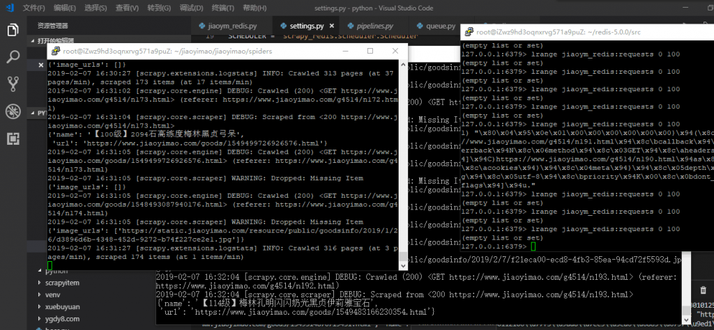 笔者在两台计算机上运行这个爬虫,可以看到分布式实现的非常成功,但是有的时候其中一台计算机会停下来进入等待状态,通过一番排查发现这并不是代码不优化的问题(而是太优化了…),Scrapy本身就是一个异步并发的爬虫框架,在运行时能同时从爬取队列中获取多条requests,也就是说一台计算机想其中push了几条requests后瞬间就将其pop走了,从上图也可看出大部分的时间里 jiaoym_redis:requests 列表时没有数据的,要解决这个问题我们可以增加time.sleep时间以降低单台计算机的爬取速度,或者给两台计算机的两个爬虫实现不同的逻辑(一个从前往后、一个从后往前等)。总而言之,因为运用了多台计算机,带宽大了,其他可调整优化的东西也就多了。