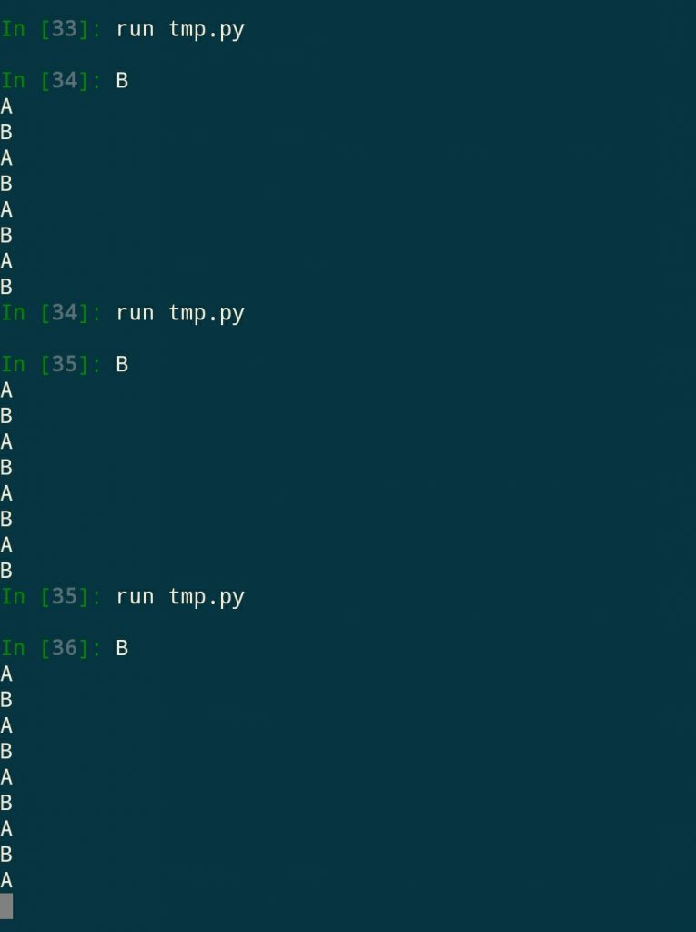 可以看到,A和B并没有按照预期各输出6次,这是因为线程执行顺序的不确定性造成的,而且event的标记和Lock也不一样,它可以重复执行set()和clear()方法,因此就可能在执行时出现不可预期的错误。所以,个人不建议使用这种方法实现线程通信。
