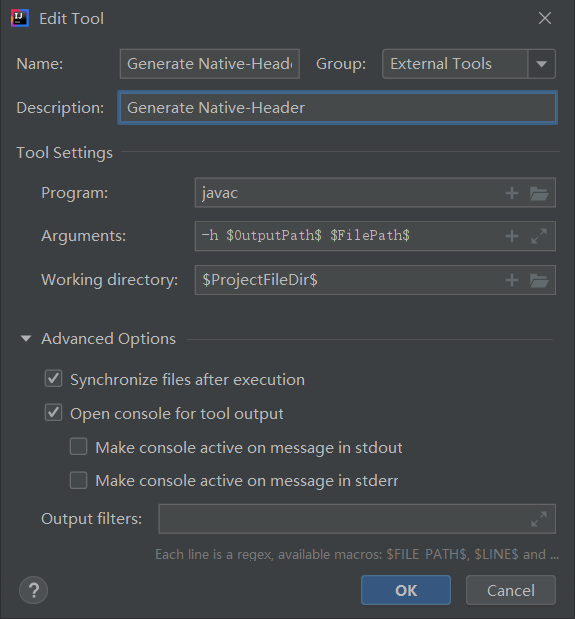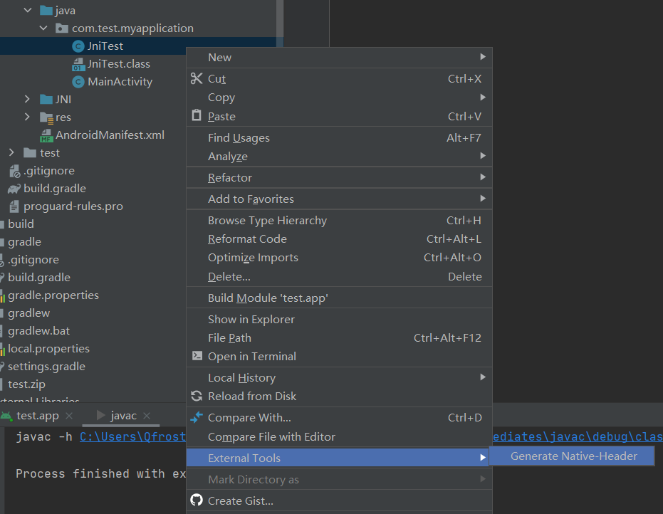 然后对包含Native声明的类右键->External Tools->Generate Native-Header,即可生成JNI的Native-Header文件。
