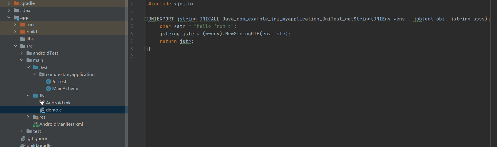 然后将前面生成的.h文件也放在同一目录下(这里重命名为demo.h)。然后在demo.c中实现SO的代码。这个写法和导出方式是标准的JNI SO写法,直接抄就好了,但要注意实现的接口函数名必须与.h中的相同。