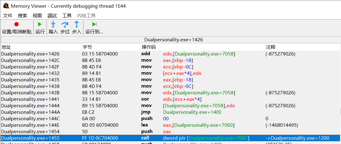 然后这里有个注意点是 dword_407058 这个常量,它会在前面的x64代码中被赋予一个初始值,并有一个反调试。可以跟随到前面的天堂之门跳转中,看到x64代码检测了PEB.BeingDebugged位,若该位为0则会赋予初始值0x5DF966AE,这个才是正确的初始值