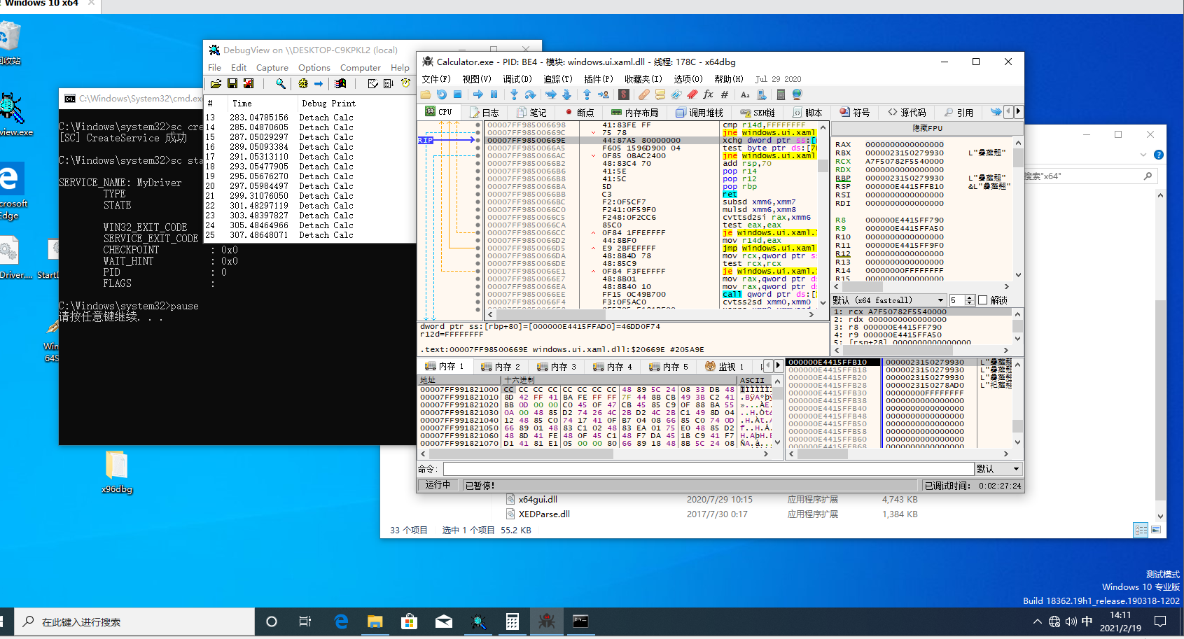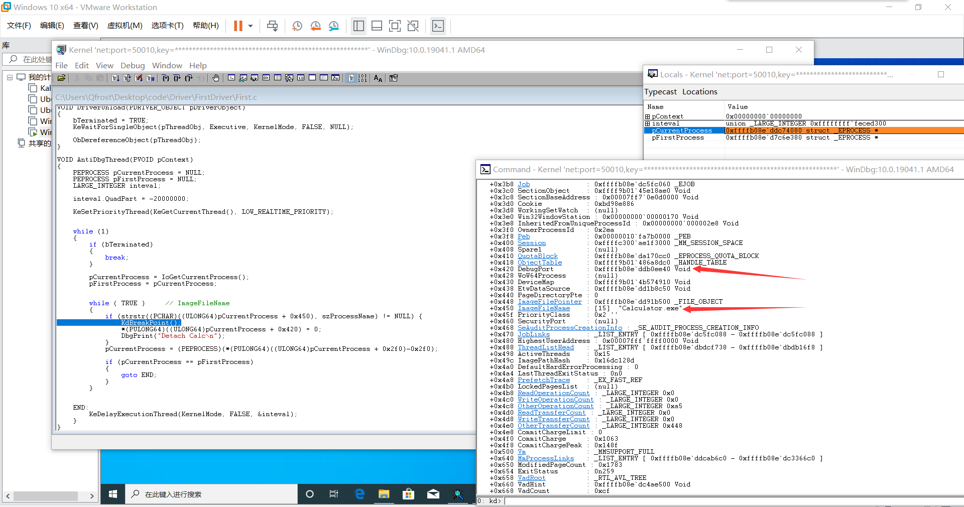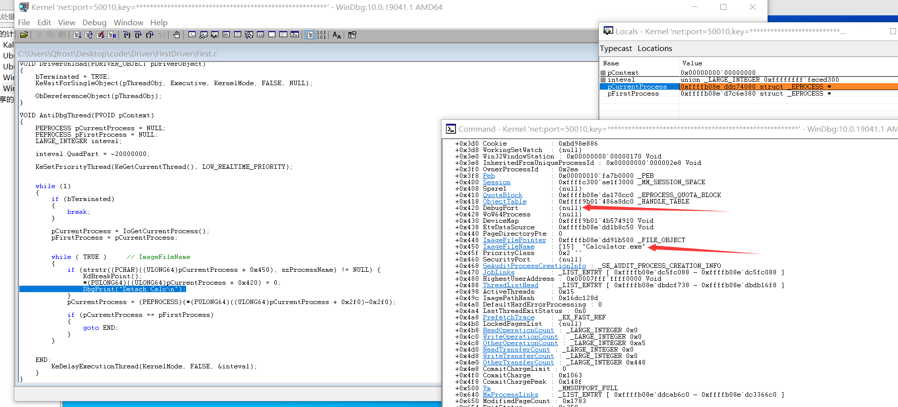加载驱动后可以在windbg上看到成功清除了计算器的DebugPort成员