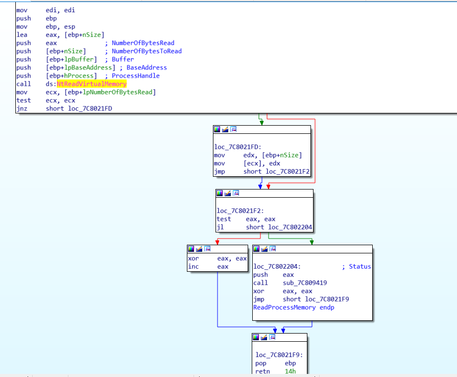 通过代码,不难看出,在这里其实就是将参数全部传给了 NtReadVirtualMemory ,然后后面的代码就是在对返回值做判断。若返回值小于0,则会跳转到 loc_7C802204。
