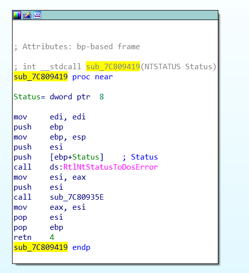 而在 loc_7C802204 里 做了一个 call sub_7C809419,而在 sub_7C809419 内,可以看到,调用了 RtlNtStatusToDosError API。