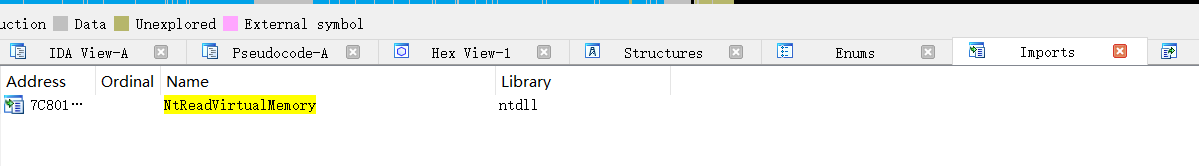 在kernel32.dll中可以看到NtReadVirtualMemory函数是粉色的,即对于kernel32.dll来说,NtReadVirtualMemory是一个外部函数,从导入表中可以看到其来自ntdll.dll
