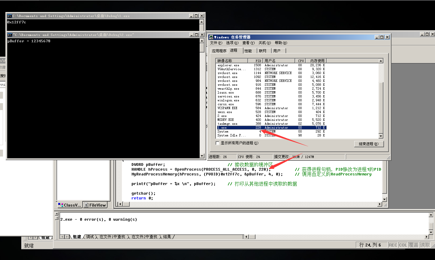 通过前面的学习,可以知道,我们调用API函数的时候会先调用kernel32.dll,然后中转到ntdll.dll,在ntdll.dll里进入0环。那么,是不是意味这么我们可以绕过kernel32.dll和ntdll.dll中的中介函数,直接进入0环?这样就相当于绕过了API调用的过程,自己实现了一个API函数,可以有效防止被hook等情况。下面就用这个例子展示一下,因为ReadProcessMemory函数的作用是读取内存,所以需要两个进程,一个进程用于提供一个变量和一个地址,另一个进程直接利用这个地址进0环获取到值。