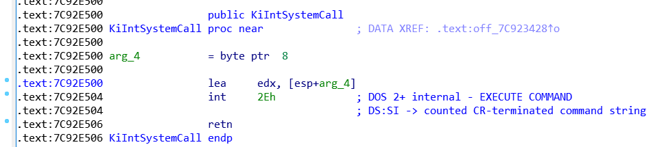 - 第二行调用了0x2e中断(所有的API通过中断门进内核时,统一的中断号为0x2e,其作用是通过EAX中的值为索引调用系统未公开函数,即进入0环)
