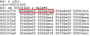而INT2E就是自陷指令,即通过自己主动的触发陷阱的方法进入系统态。相信大家应该都知道,IDT表其实就是一个索引表,每个中断门描述符对应着一个中断处理函数,那么我们同样来分析一下这个门描述符 (对门描述符分析有疑问的参见Windows保护模式学习笔记(2)—— 调用门&中断门&陷阱门