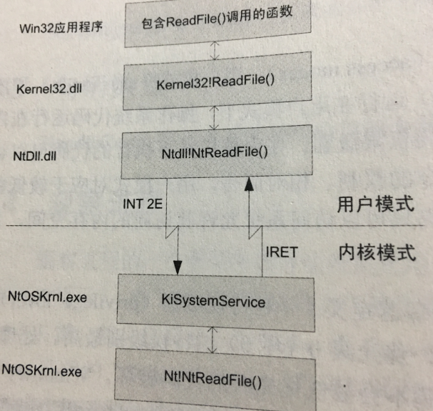 下面我们用一个例子(ReadFile函数)来看一下通过中断门进0环的一个整体的调用过程