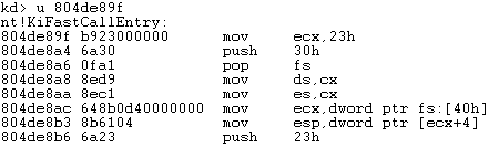 前面我们说过,系统在初始化的时候根据CPU是否支持快速系统调用而使*_KUSER_SHARED_SYSCALL(0x7ffe0300)*指针指向KiIntSystemCall()或KiFastSystemCall(),所以我们这里看一下快速调用时调用的函数KiFastSystemCall()