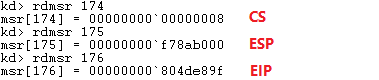CPU如果支持sysenter指令,操作系统会提前将CS/SS/ESP/EIP的值存储在MSR寄存器中,sysenter指令执行时,CPU会将MSR寄存器中的值直接写入相关寄存器,没有读内存的过程,所以叫快速调用,但其与中断门调用进入0环的本质是一样的。 在执行sysenter指令之前,操作系统必须指定0环的CS段、SS段、EIP以及ESP,其中,CS段、EIP以及ESP来自MSR寄存器,下面看一下该寄存器的结构(该寄存器非常庞大,这里只列出三个最重要的值)